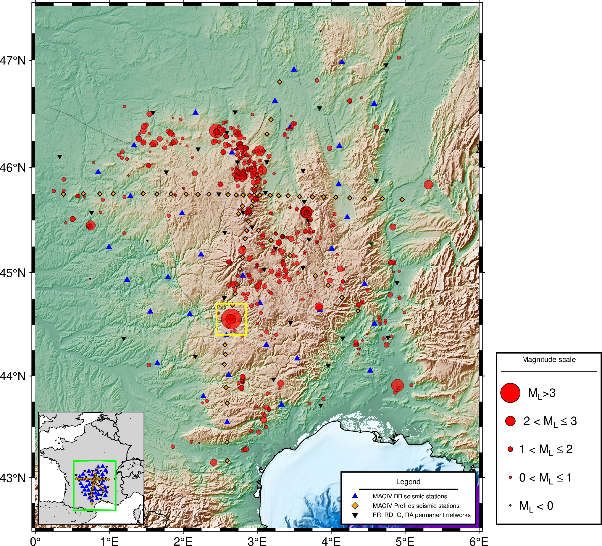 - carte des épicentres des séismes localisés par l’équipe MACIV (C. Aubert & G. Scheiblin) entre le 01-06-2023 et le 01-08-2025. La taille des cercles est fonction de la magnitude. Le cadre jaune indique la région du séisme de Sébrazac et de ses répliques.