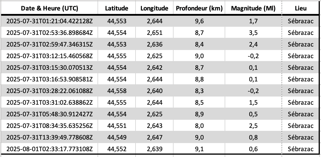 - tableau des caractéristiques (heure-origine, localisation, magnitude) des (micro)séismes enregistrés dans la région de Sébrazac le 31/07/25 et le 01/08/25. Le séisme principal est le second dans la liste (04:53 locale, Ml=3.5). Le 1er, à 03:21 locale (01:21 TU, Ml=1.7) est un "foreshock" (séisme précédant le choc principal) alors que les 10 suivants, à partir de 04:59 locale (02:59 TU) sont des répliques. Les profondeurs des foyers sont comprises entre 8 et 10 km ;