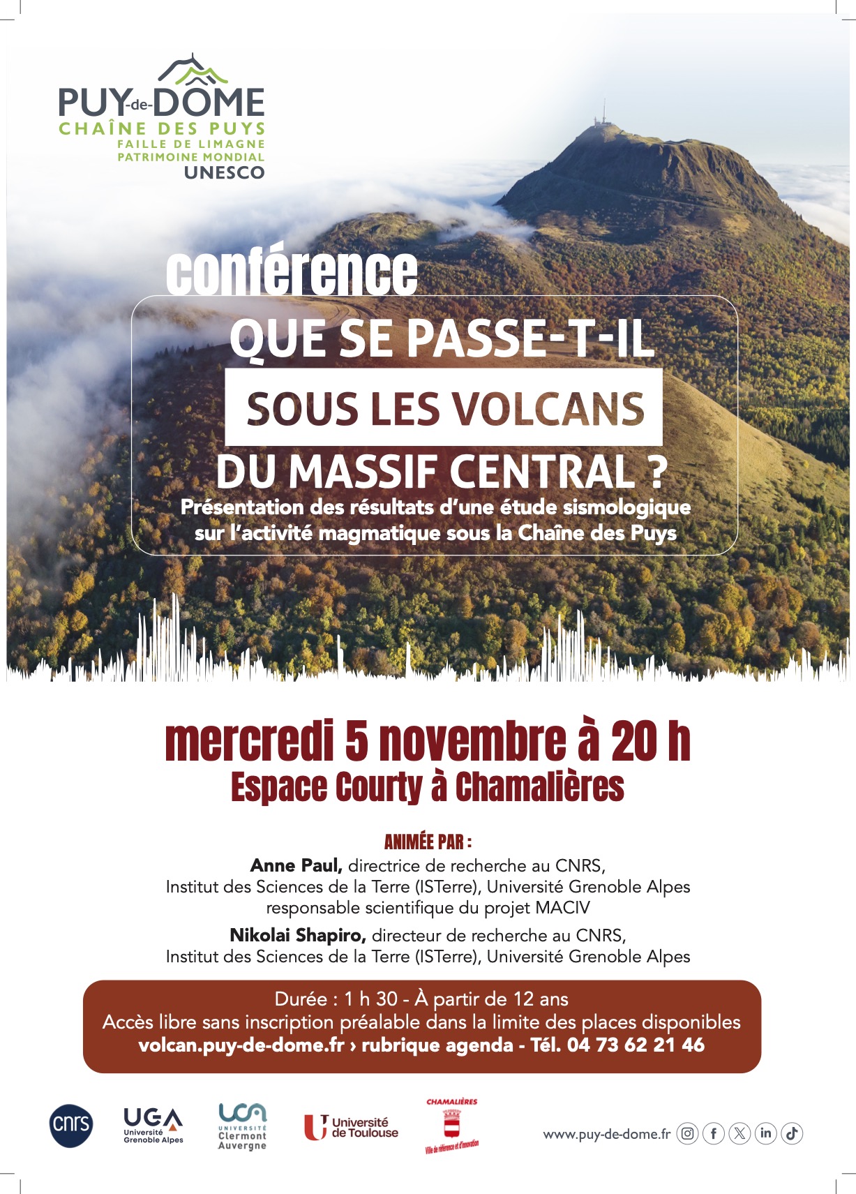 Le 5 novembre à 20h, à l’Espace Courty de Chamalières, Nikolaï Shapiro et Anne Paul, responsables scientifiques du projet MACIV donneront une conférence destinée au grand public.