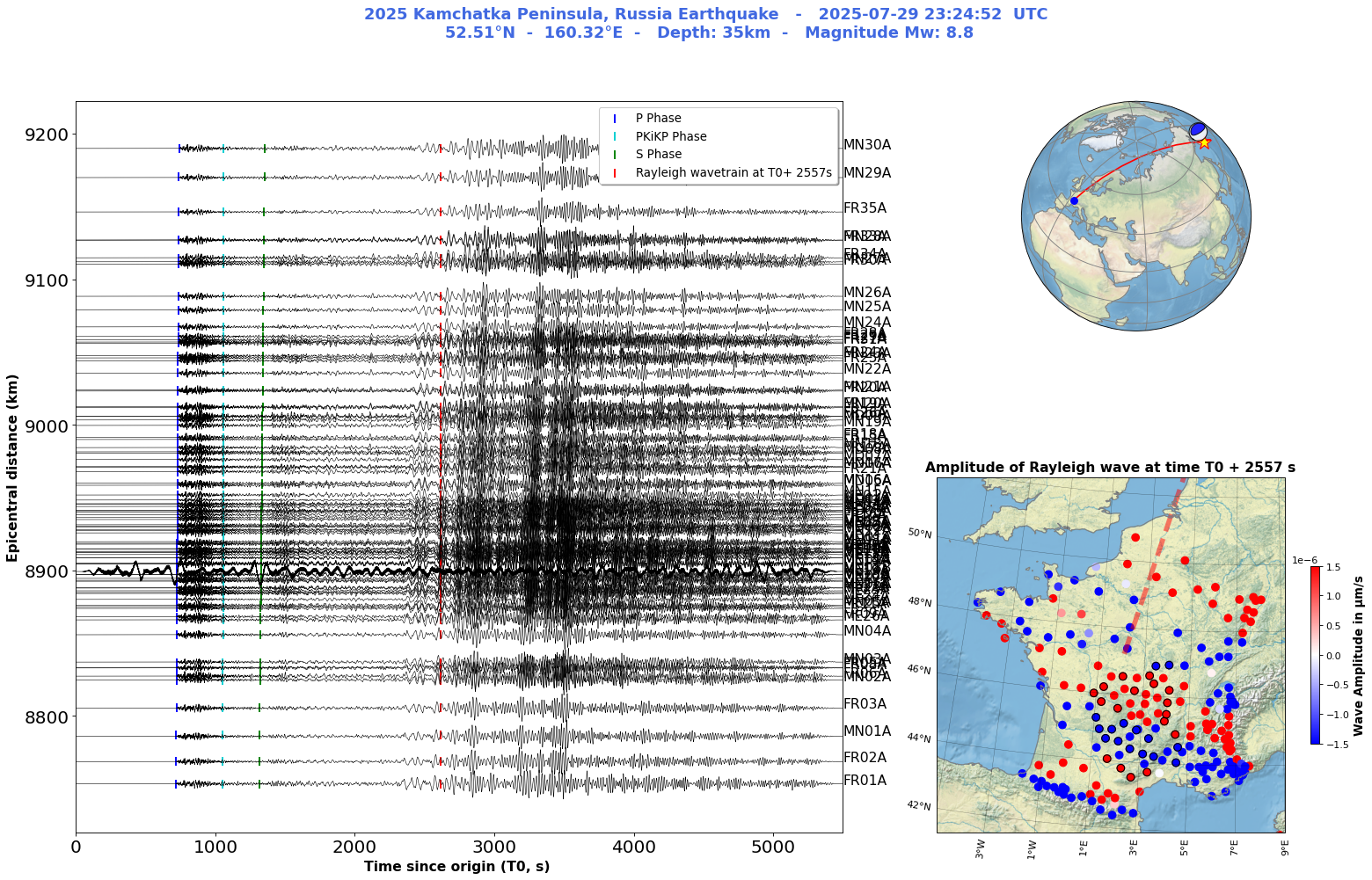 The video below shows the vertical ground velocities caused at French seismological broadband stations (including MACIV’s temporary XP network) by the passage of seismic waves generated by the earthquake. Blue disc : the ground moves upward ; red disc : the ground moves downward. The red line shows the direction of arrival of the waves from the source region in Kamchatka (Russia). The undulations of the ground caused by the propagation of seismic waves are clearly visible. The fastest waves (known as P waves) reach France, 9,000 km away, nearly 12 minutes after the earthquake’s origin time, i.e. around 23:36 (UTC). The video shows that the ground vibrations caused by the passage of seismic waves last for more than 1 hour and 40 minutes.